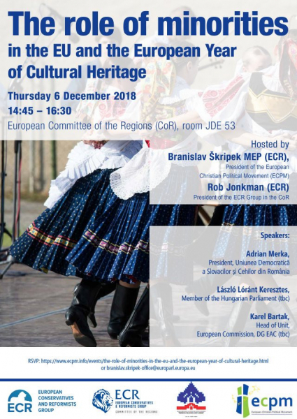 The ECR Group in the European Committee of the Regions co-organised a conference with the European Christian Political Movement on “the role of minorities in the EU and the European Year of Cultural Heritage”. The event, which took place on 6 December 2018, brought together local and regional politicians with representatives of the European Parliament to exchange views on how community-led solutions can help promote Europe’s cultural heritage.